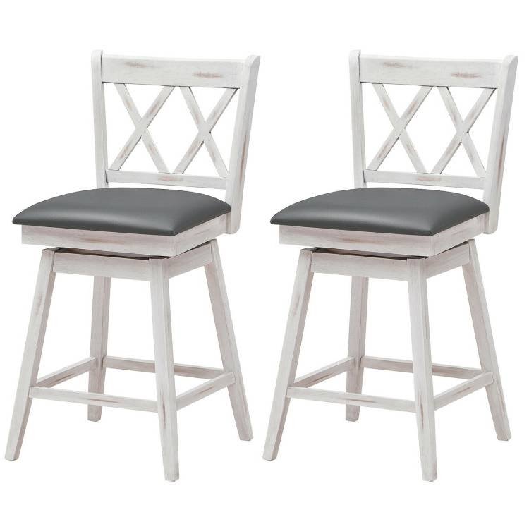 Equipped with a swivel seat, this Set of 2 White Wood 24-in Counter Height Farmhouse Swivel Cushion Seat Barstools allows you and your guests to switch directions freely, which make conversation easier. The premium footrest are able to help you rest your legs and find the most comfortable sitting position. The high density sponge padded with breathable leather covers will not only keep you away from the stuffiness, but also provide you with maximum comfort . Additionally, the ergonomic backrest gives your back additional support. The bar stool is made of high quality rubber wood with a X-back frame, making it superior to stability and durability. And it can hold up to 264 lbs. Also, the solid leg keep it stable without shaking. With simple lines and rustic chic appearance, this 2pcs bars stools adds a stylish and sophisticated look to any room. It can be perfectly matched with various decorative styles, and you can put it in your kitchen, living room, bar, cafe or restaurant. There are required parts and detailed instructions in the package. You only need to spend a little time to put it together. Besides, the upholstered seats are covered in easy-care PVC surfaces. So you can clean it effortlessly by a damp cloth.