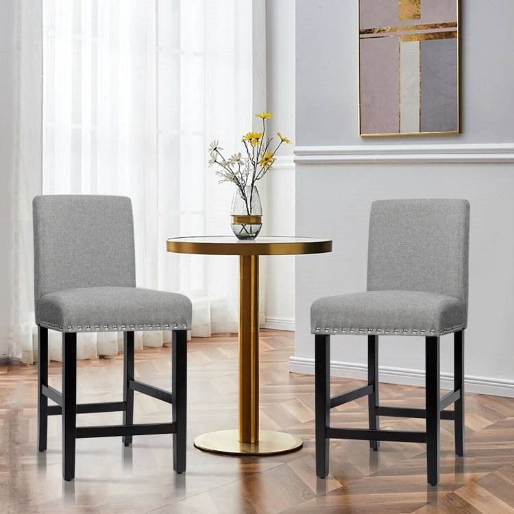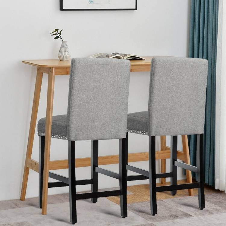 This Set of 2 Modern Kitchen Dining Barstools w/ Black Wood Legs and Grey Linen Seat would be a great addition to your home. The soft cushions of the backrest offer great softness, much more than ordinary bar stools. As well, the interior spring beneath the seat makes for great elasticity and support. The extra breathable linen fabric is amazingly durable and will provide lasting comfort. No matter how tall you are or how long your legs are, these barstool allow you to sit comfortably. The curved backrest is designed to alleviate back strain and provide extra support, while the wide seat is designed to cater to all manner of people – perfect for commercial as well as in-home use. The wood legs feature great sturdiness and enable these barstools to provide firm support. The 4 bars connecting the legs provide a footrest as well as adding to the structural integrity of the stools. Plus, there is no need to worry about any wobbling as the adjustable foot pads provide stability even on uneven floors. The various rivets around the seat add an aesthetic beauty to these bar stools. The stylish appearance makes these a perfect complement to either your dining table or kitchen counter. Use these bar stools to enjoy a drink or as dining chairs to entertain guests. The assembly process is a breeze for anyone thanks to the simple structure and easy-to-understand instructions. Requiring less time and effort, the assembly process is much easier than that of other bar stools. In addition, the solid construction provides great stability and a long life span.