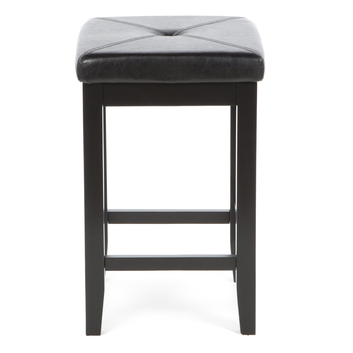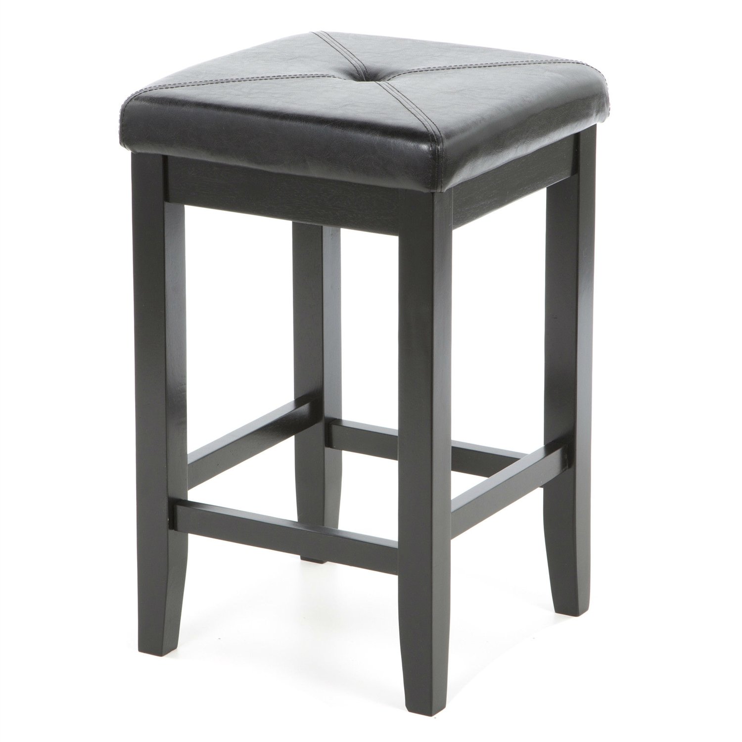 Comfort and style combined. This Set of 2 - Black 24-inch Backless Barstools with Faux Leather Seat features solid hardwood construction. The cushioned seat is upholstered in simulated leather, that is stain and spill resistant.