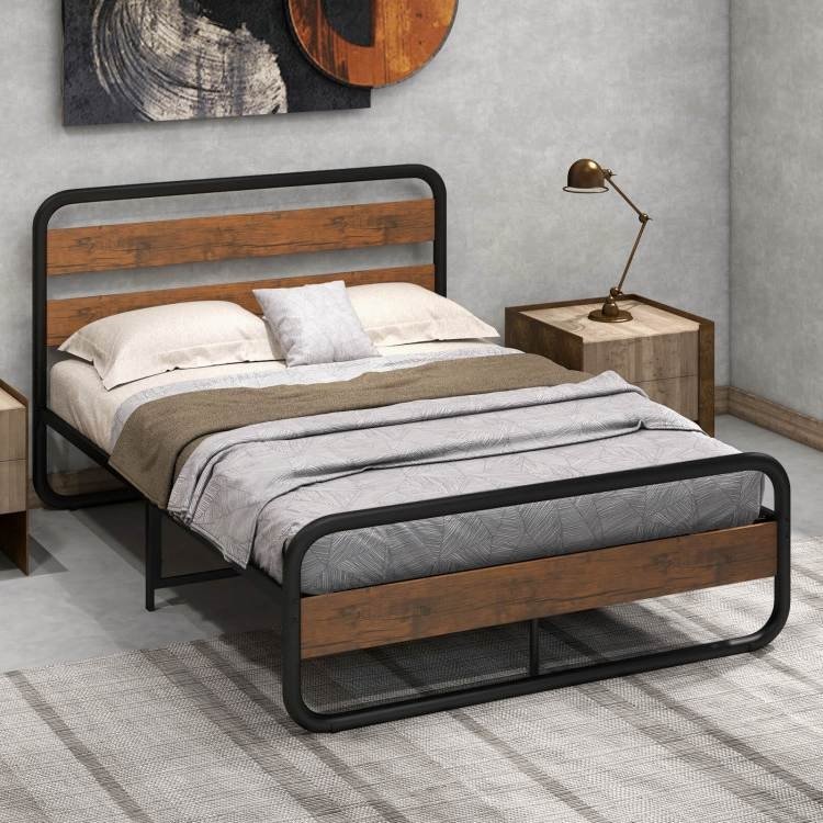 Rustic wood grains meets simple black metal making this Queen Size Rustic Arc Tube Head/Footboard Platform Bed Frame an attractive must have in any FarmHouse bedroom. Bed frame is 13 inches off the ground, which offers large space for storage of shoes, bed sheets, etc. Features arc corners to avoid hurtful collisions and comes with preinstalled EVA pads for less frictions between the slats and frame. Holds 660 lbs. and works best with an 8-12 inch standard queen size mattress.