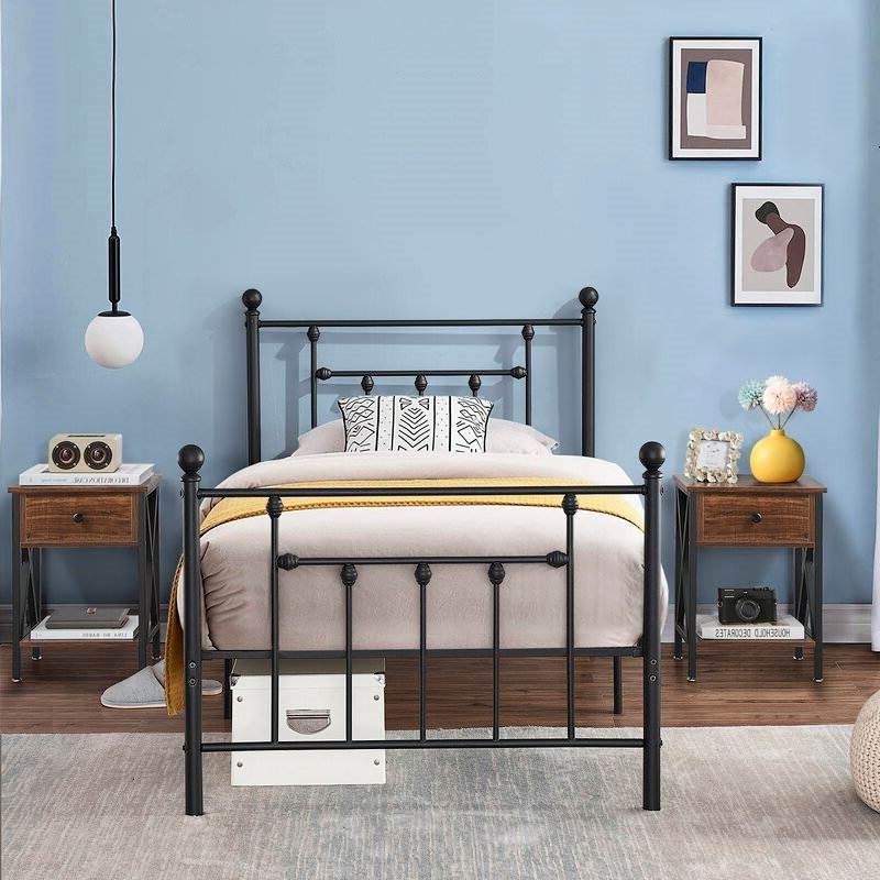 This Rustic 1 Drawer Brown Nightstand - Set of 2 showcases a mix of materials for a rustic and traditional look in any home. Each bedside table is made from steel and engineered wood and rests on straight legs with sleek X-shaped accents on the side. The single drawer with a black handle opens to reveal room for essentials like reading glasses and personals. An open shelf is ideal for a stack of books and organizational baskets. This nightstand set features 16" broad surfaces that accommodate a table lamp and a few accent pieces. Simple stylish design options are functional and suitable for any room, sturdy on a flat surface, and easy to assemble with parts and tools included.