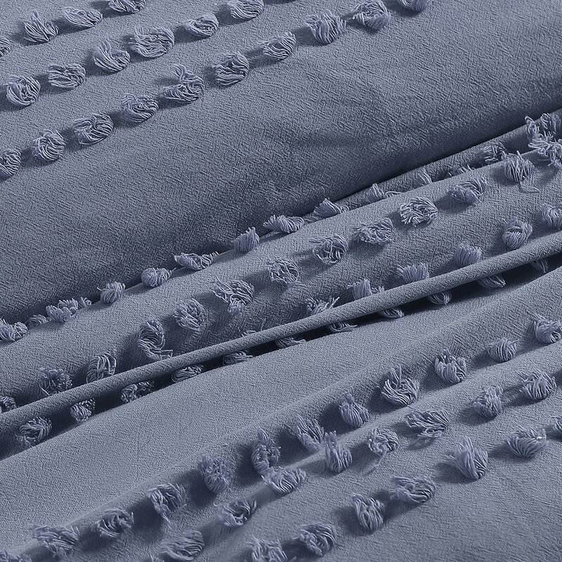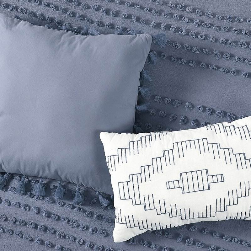 This 5-piece Full/Queen 100% Cotton Boho Dot Comforter Set Denim tops your bed with laid back style. Complete set includes 1 comforter, 2 matching pillow shams, 2 square throw pillows. 100% pre-washed cotton that only gets softer over time and a clip dot design that lends visual and tactile appeal. This product is Oeko-tex certified to contain no harmful substances or chemicals, ensuring quality comfort and wellness. Crafted with premium pure cotton for breathability and superb moisture absorption ability to ensure a cool, comfortable, and refreshing sleep. The three-season comforter has a polyfill filling that plumps up easily, which means quick bed-making. This set requires hand washing. If you love a layered look, add a couple more accent pillows in complementary colors or bold patterns.