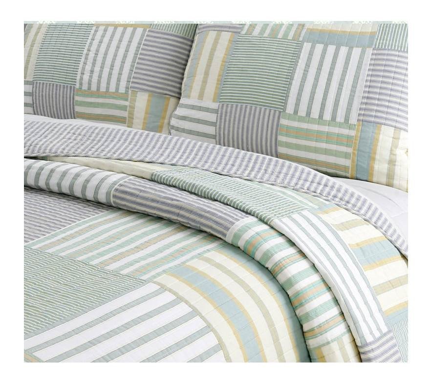 Create a beautiful tranquil welcoming place within your home with this Full/Queen Size Soft Reversible Patches 100% Cotton Quilt Set. The balance of stripped patterns and calming colors tones are a perfect combination. A variety of horizontal and vertical stripped patterns in various shades of green, yellow, blue patchwork together in a square patchwork balance together. This cotton quilt set is reversible so that you can quickly and easily change the look of your room. Made completely of 100% Cotton. Easy-care machine-washable cotton material, this quilt set is easy and quick to launder.