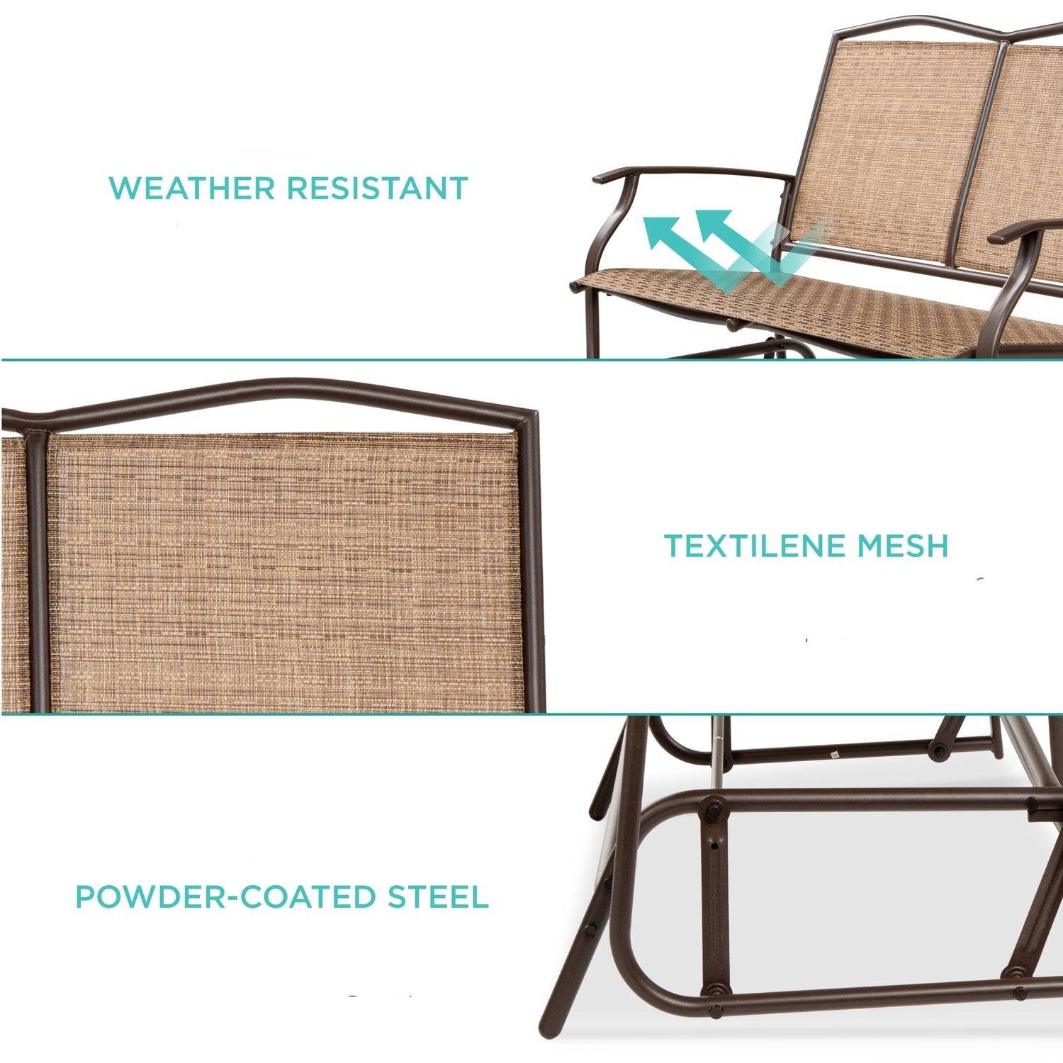 Enjoy hours of comfort with this 2-Seater Weather-Resistant Mesh Patio Glider Rocker in Brown. Built with ergonomic armrests and durable textilene fabric over a sturdy, lightweight, powder-coated steel frame, it supports up to 440 lbs. This 38-inch loveseat's smooth rocking motion and weather-resistant materials make it perfect for any patio, garden, balcony, or porch.